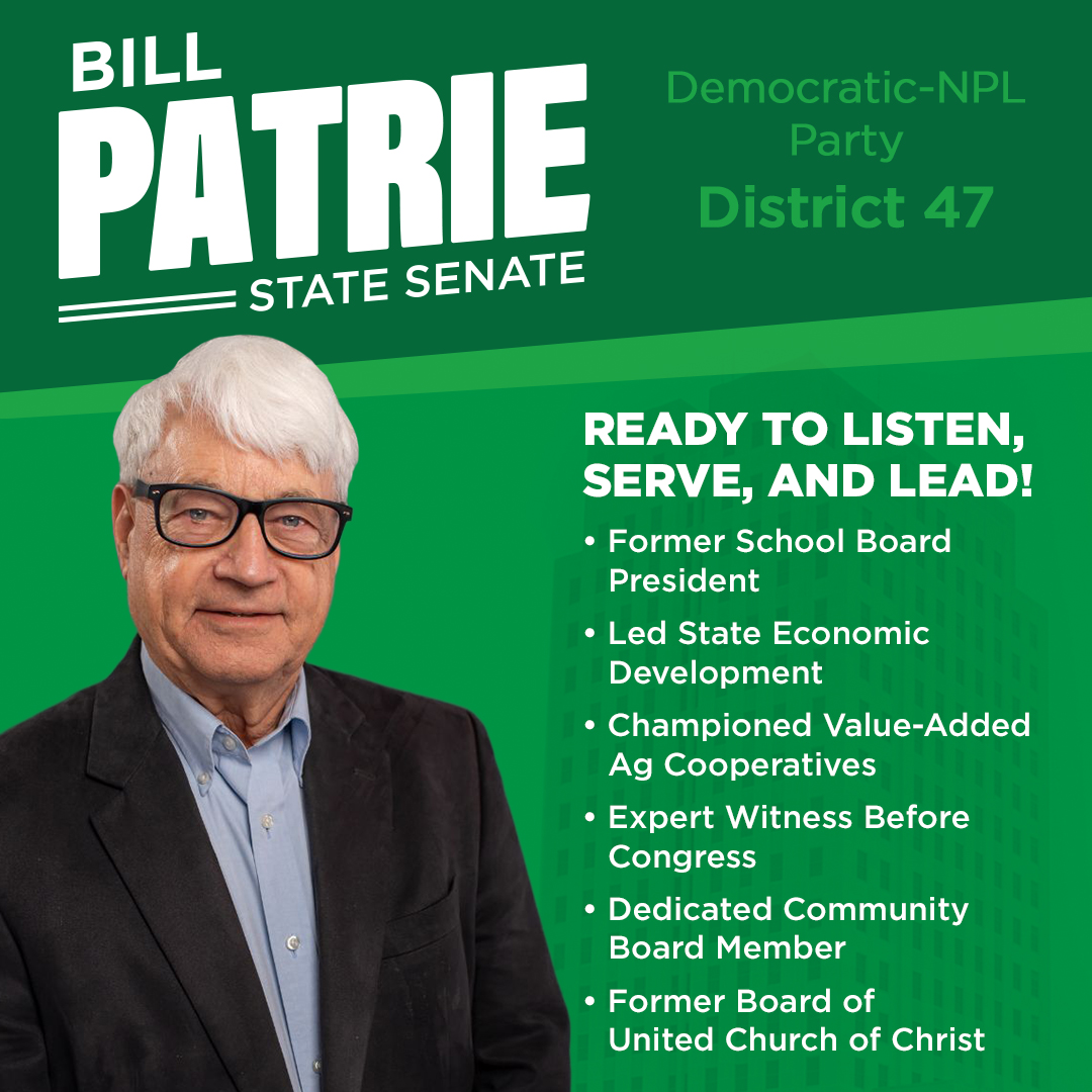Bismarck, ND — Bill Patrie, a retired economic development leader and cooperative development specialist, has announced his candidacy for the North Dakota Senate representing District 47 as part of the Democratic-NPL Party’s Region 6 slate.