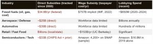 But Boeing is merely the headliner. The top twenty subsidized industries in America — spanning energy, automotive, aerospace, technology, retail, chemicals, and finance — have together received over $250 billion in disclosed subsidies since the turn of the millennium.