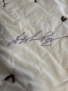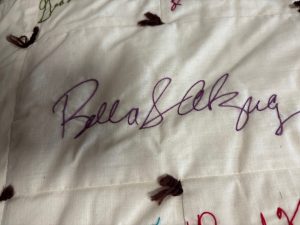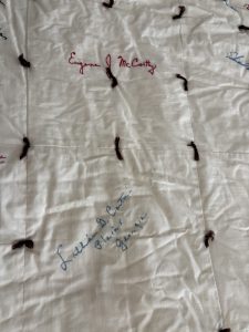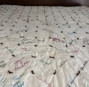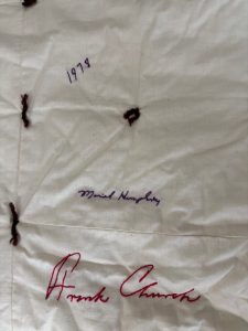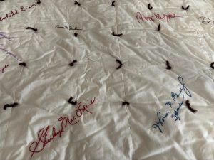 Among the signatures on the quilt that many would say are still carry national recognition are Robert Redford, Paul Newman, Shirley MacLain, Ted Kennedy and Thomas (Tip) O’Neill, Jr.