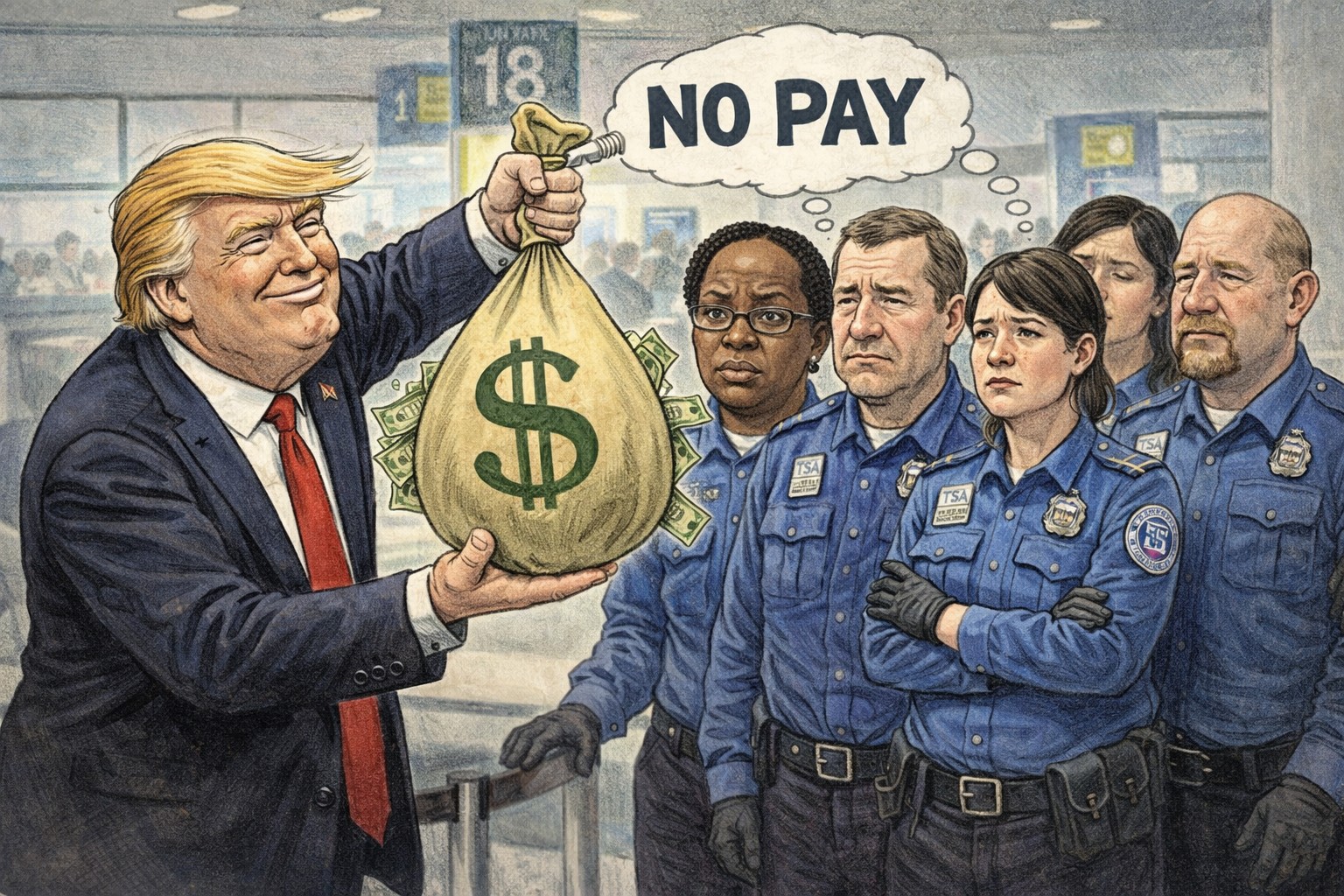 A president who has bombed a sovereign nation without a congressional vote, demolished a wing of the White House without a permit, and abducted a sitting foreign head of state has absolutely no legal or moral excuse for leaving 60,000 airport security officers without a paycheck. The audacity isn’t incompetence. It’s a choice.